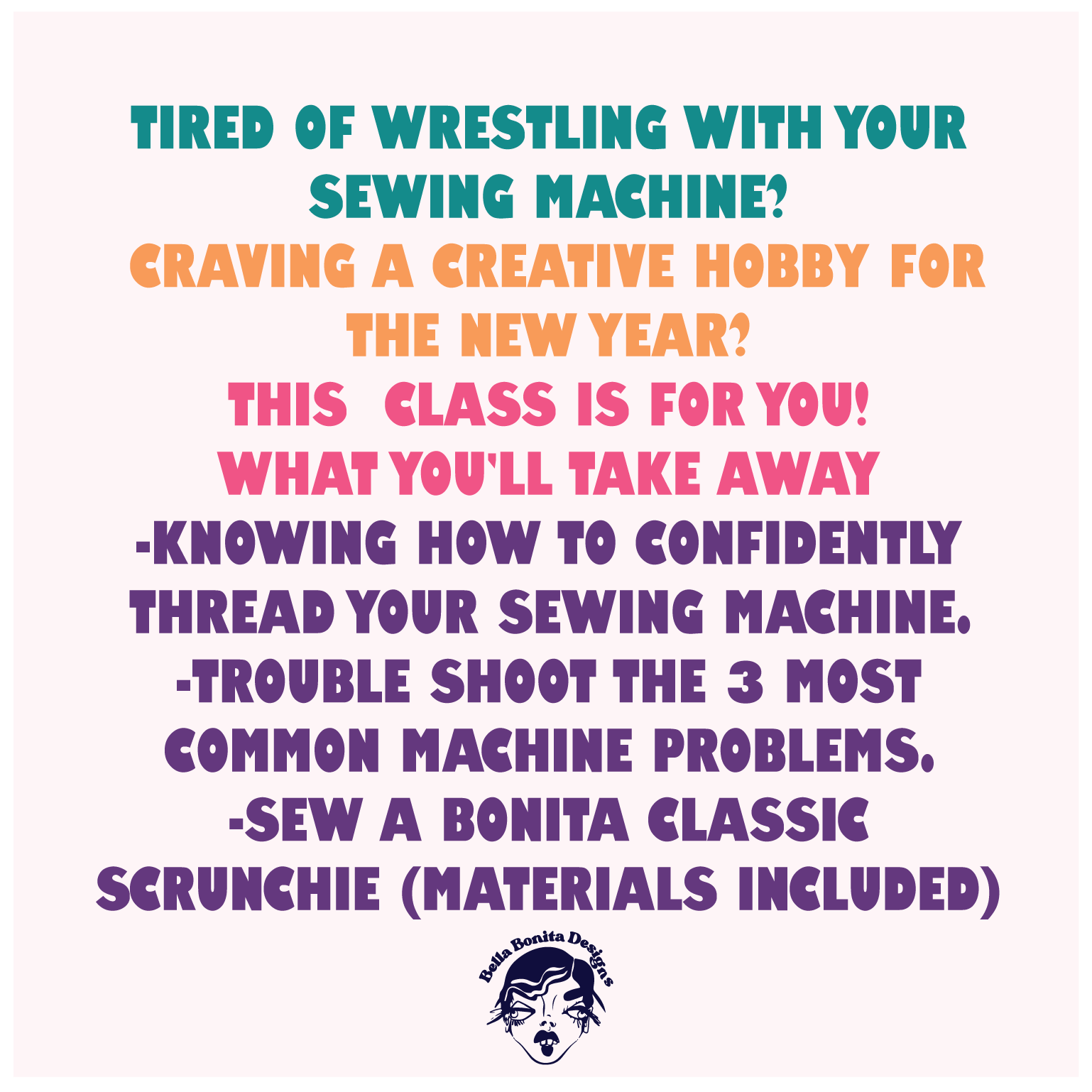 Join Stella for a night of discovering the basics of sewing, including how to seamlessly set up your machine, and how to handle the top three issues people have with their sewing machine. Students will take home a scrunchie they made during the class.